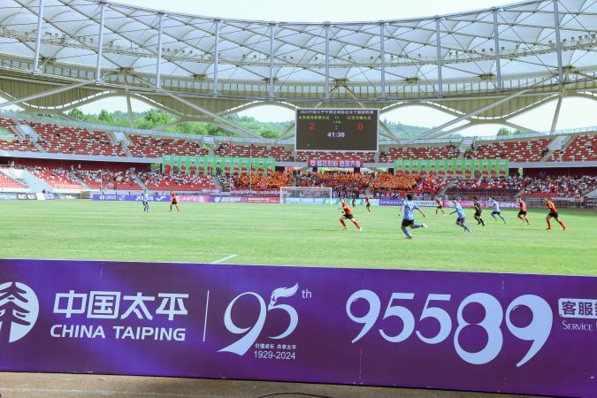 在20名太平人壽員工身著“中國太平”志愿者服裝組成的旗手隊手持中國太平標志的中圈地鋪入場后,山東與江蘇兩支隊伍展開了激烈的對決。在助威團的吶喊聲中,雙方隊員都展現(xiàn)出了出色的競技狀態(tài),經(jīng)過90分鐘的角逐,雙方最終以2:2握手言和,精彩的比賽贏得了現(xiàn)場觀眾的陣陣掌聲和喝彩。