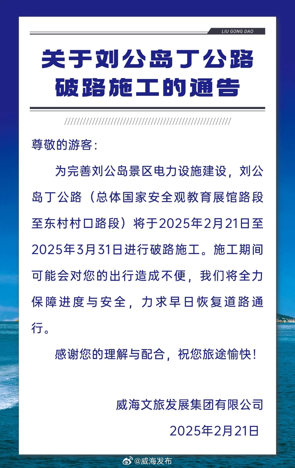 2月21日即日起至3月31日,劉公島部分路段進行破路施工。 ???