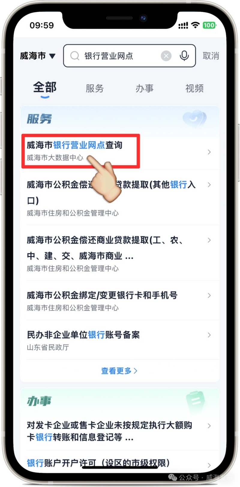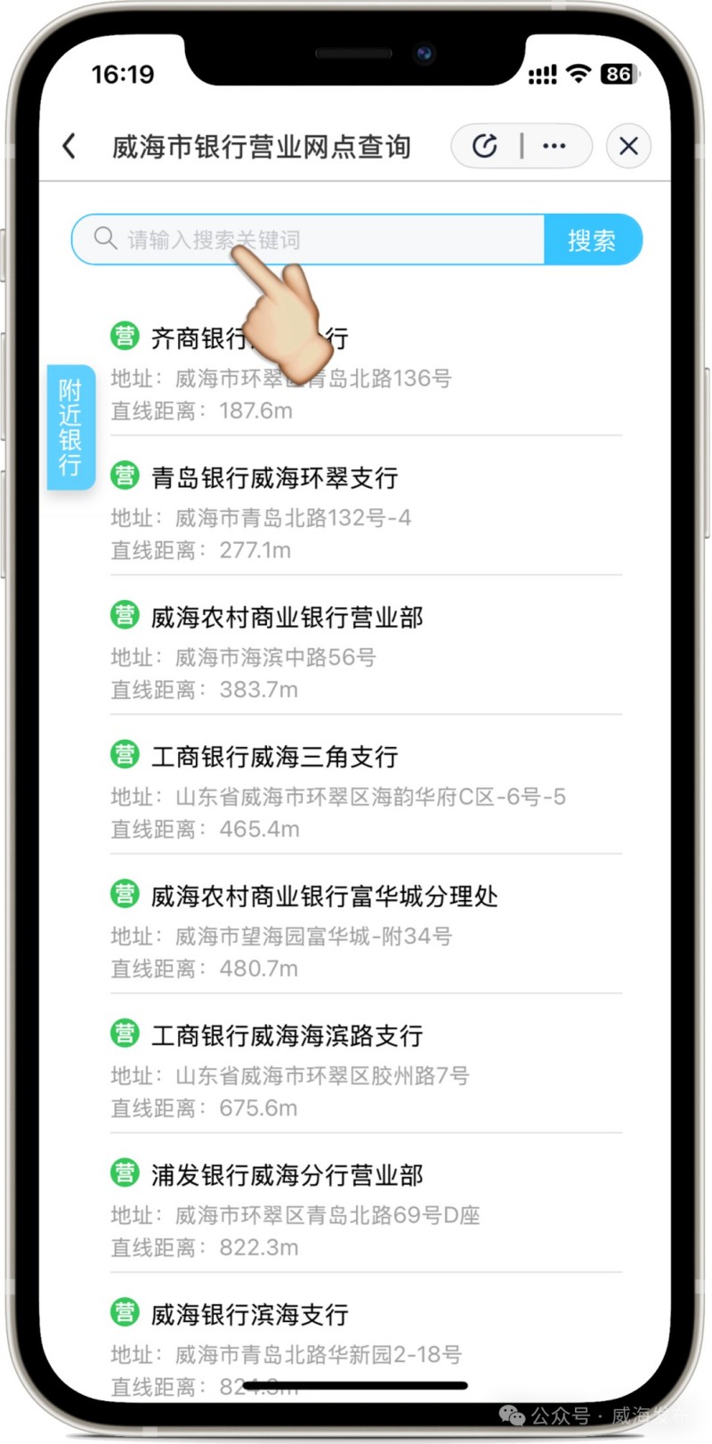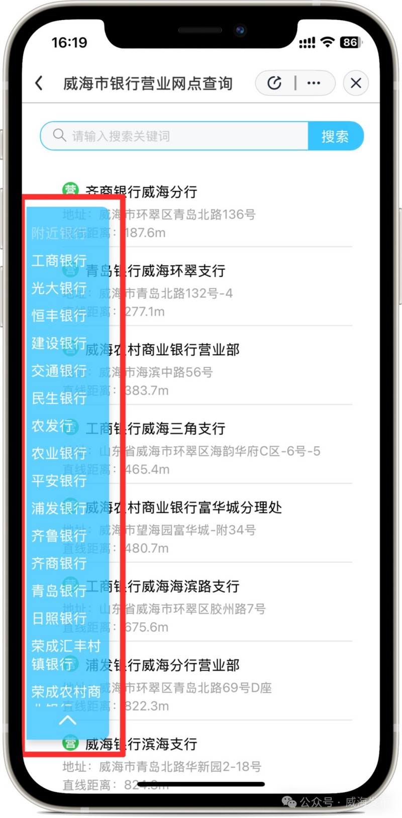 進(jìn)入“愛(ài)山東”APP后,在首頁(yè)左上角選擇進(jìn)入“威海市”,在搜索框搜索關(guān)鍵詞“銀行營(yíng)業(yè)網(wǎng)點(diǎn)”,點(diǎn)擊進(jìn)入應(yīng)用。