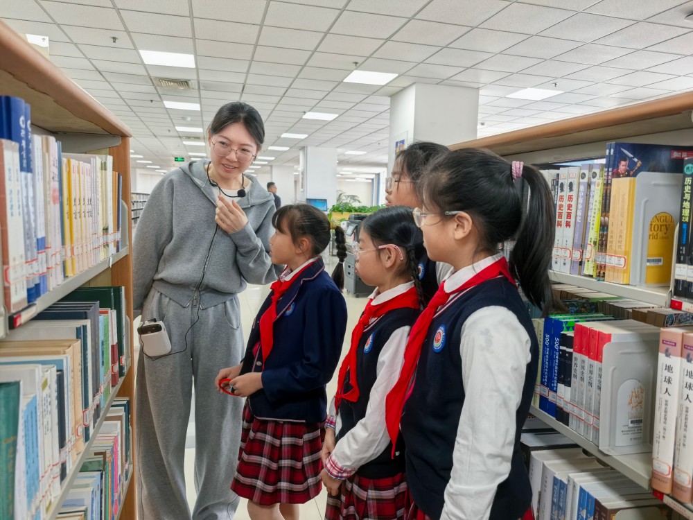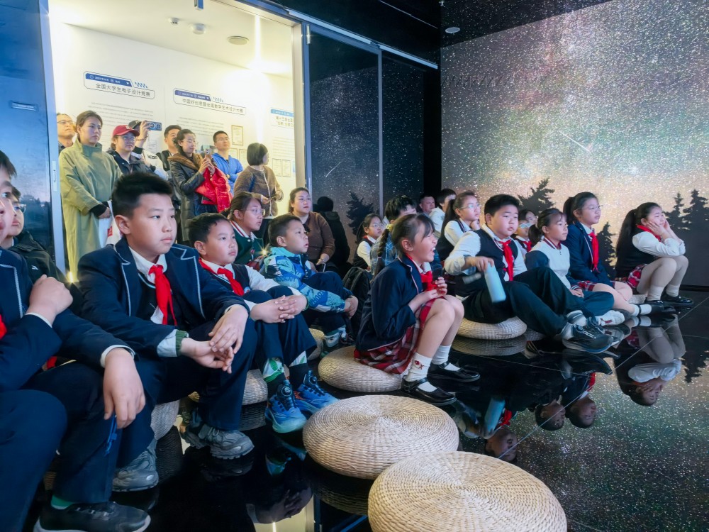 隨后,大家走進(jìn)山東大學(xué)(威海)圖書館。這座現(xiàn)代化圖書館以豐富的館藏和先進(jìn)的管理模式令學(xué)生和家長贊嘆不已。據(jù)介紹,圖書館館藏紙質(zhì)文獻(xiàn)超過800萬冊,同時配備了現(xiàn)代化的管理系統(tǒng)和多媒體操作平臺。最受孩子們歡迎的是圖書館內(nèi)的360度全景科普屏——輕輕點(diǎn)擊,宇宙星辰、深海世界、遠(yuǎn)古恐龍、浩瀚星空便環(huán)繞身邊,帶來沉浸式的閱讀與學(xué)習(xí)體驗(yàn)。孩子們紛紛感嘆:“原來圖書館不只是看書的地方,還可以這么酷!”在這里,書香文化與現(xiàn)代科技完美融合,讓孩子們真切感受到閱讀的魅力和知識的力量。