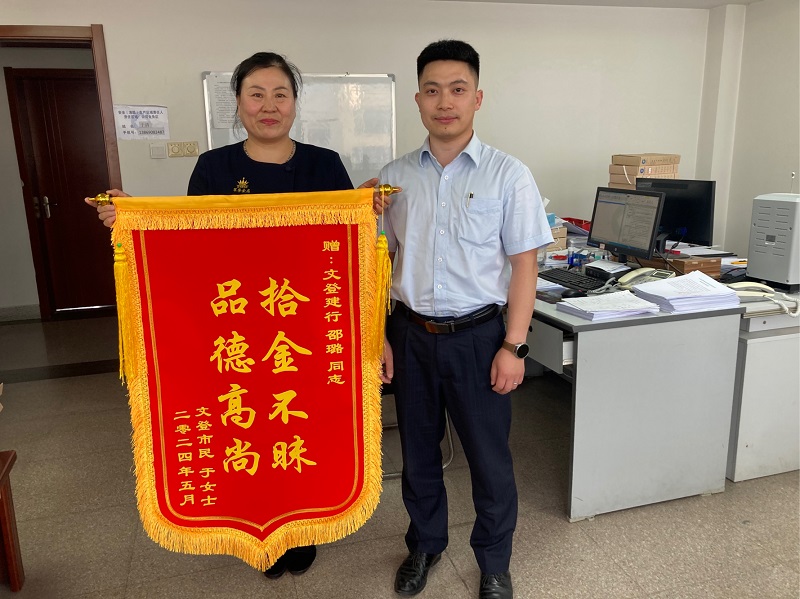 5月14日下午,于女士帶著一面錦旗來到建設(shè)銀行威海文登支行,詢問邵璐是否在這里工作,要當(dāng)面感謝邵璐經(jīng)理。經(jīng)過于女士的講述,原來她的手機(jī)于上5月12日晚聚餐結(jié)束后丟失在路邊,而自己并未發(fā)覺。邵璐撿到手機(jī)后,在鎖屏照片里發(fā)現(xiàn)于女士工作的店名,繼而搜索到該店的抖音號(hào),通過老板聯(lián)系到于女士家屬,于女士這才得知自己手機(jī)丟失。